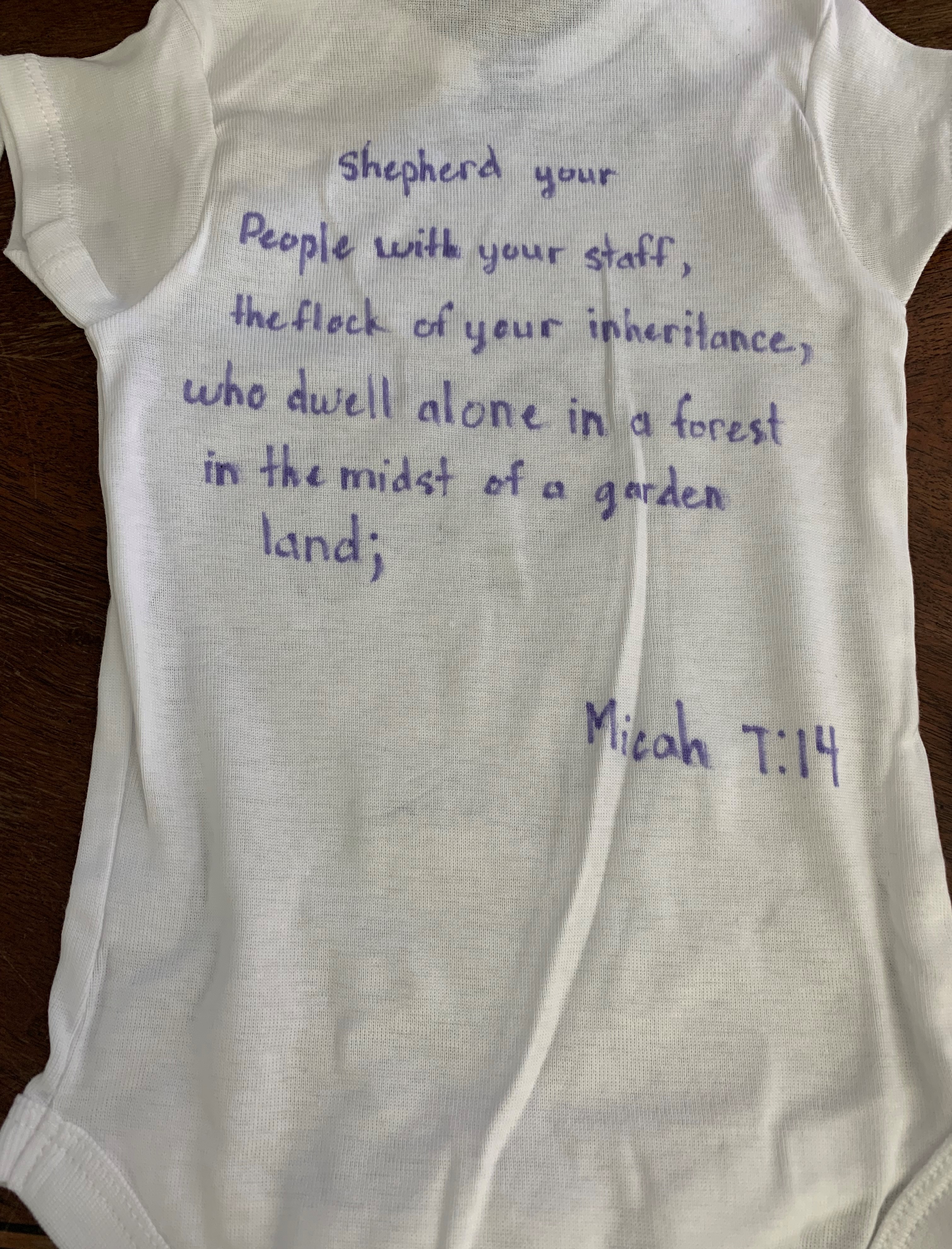 - MICAH'S ONESY: As our littlest and our newest Forgiven Life family member, Micah Pool, joins the Church, the children show their love for one another by writing scripture verses from the book of Micah on baby onesies as a gift to Micah.